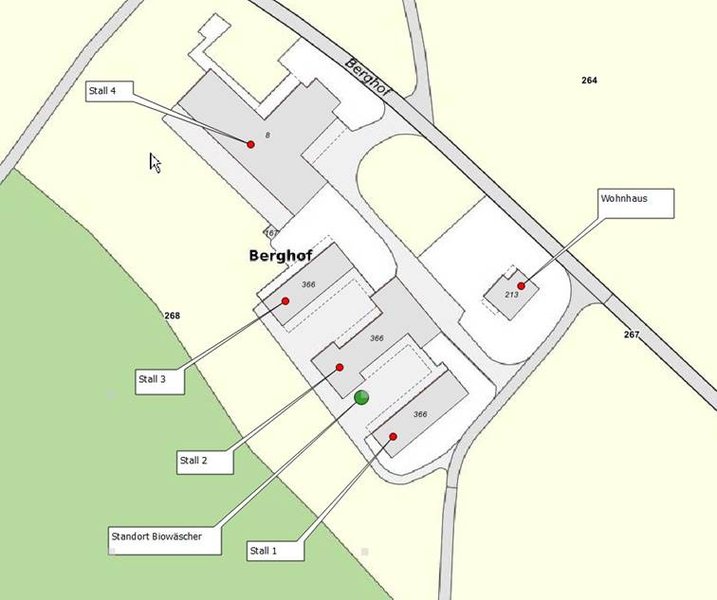 Vue aérienne des bâtiments : « Stall 1 » = nouveau bâtiment pour les truies, en vert : forêt